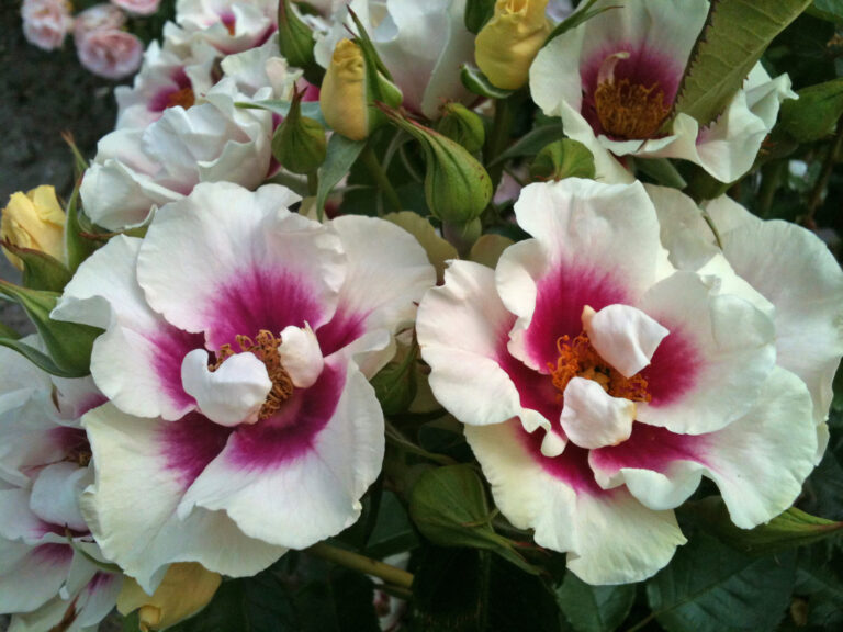 Couleur : Bicolore, blanc-crème à rosé, oeil rouge framboise