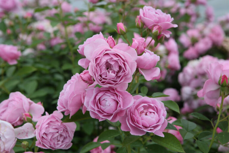 CATHERINE DE MEDICIS est un rosier buisson aux fleurs groupées rose à reflets parme accompagné d'un parfum subtil. Son feuillage est vert foncé, satiné. -