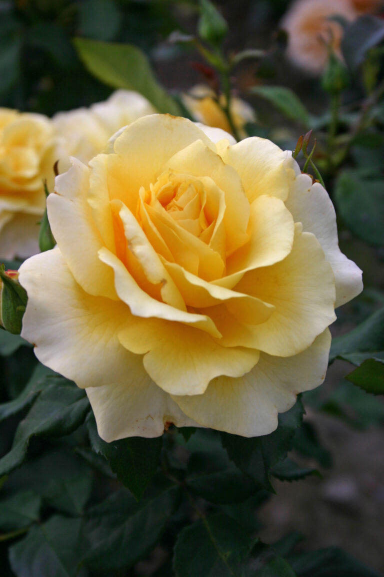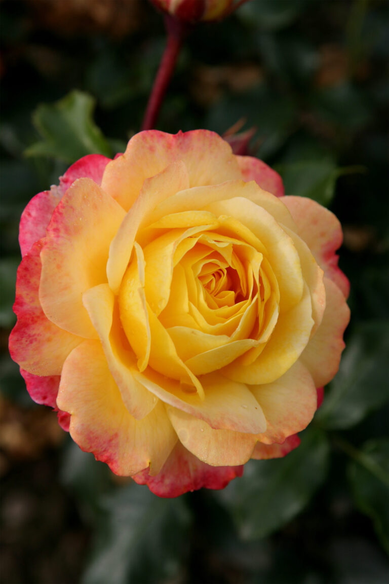 SUNNY SKY est un rosier buisson au grandes fleurs jaune miel se teintant de rose en bordure. Il est également produit en tige.