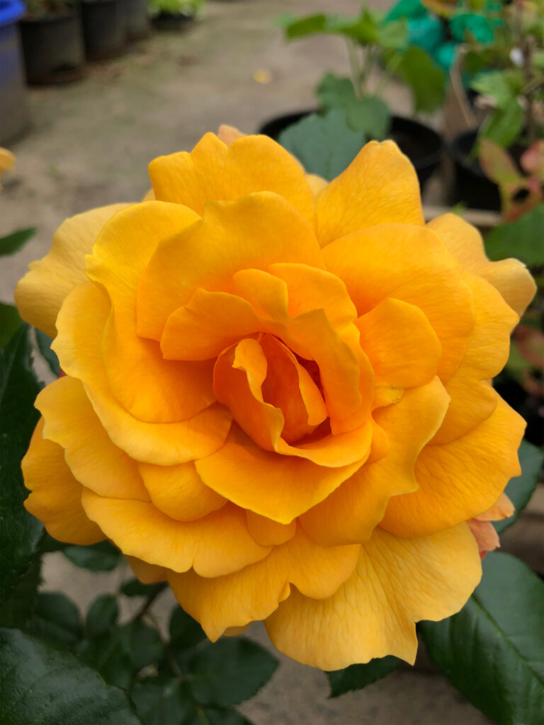 FRANCOISE DE BERVILLE est un rosier buisson aux grandes fleurs orange flamboyant en bouton pour s’épanouir en jaune orangé. -