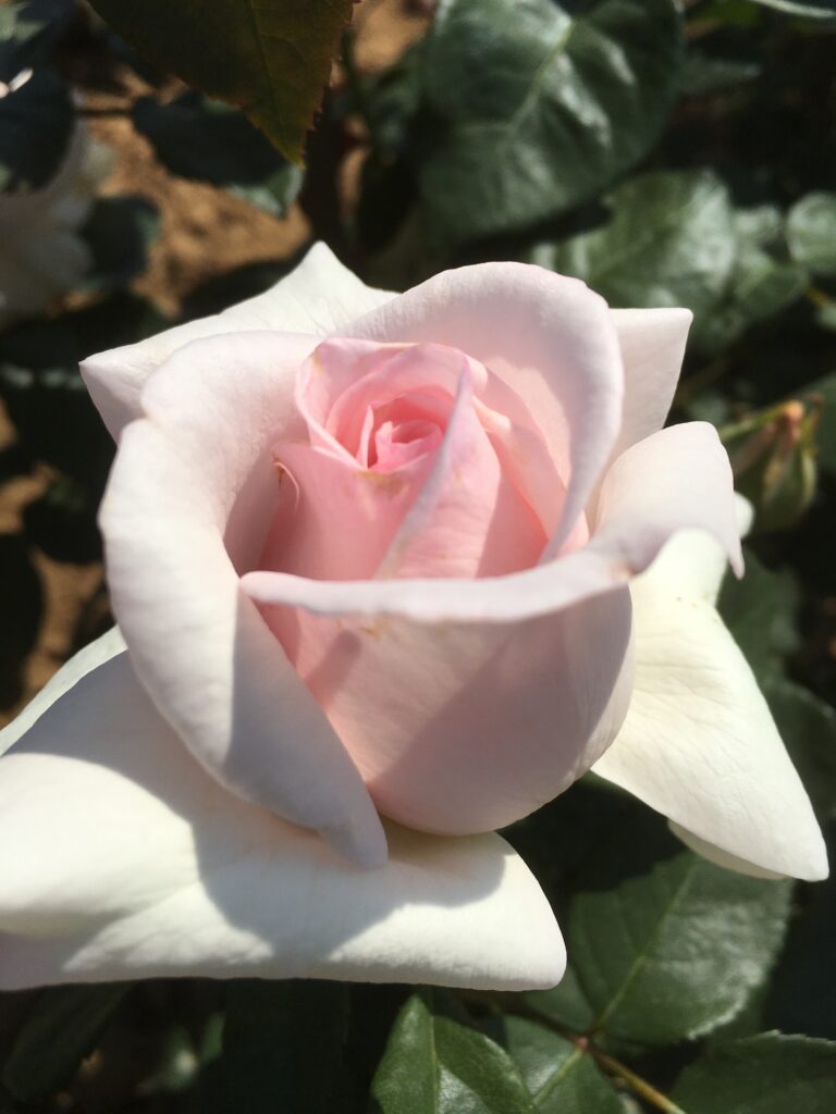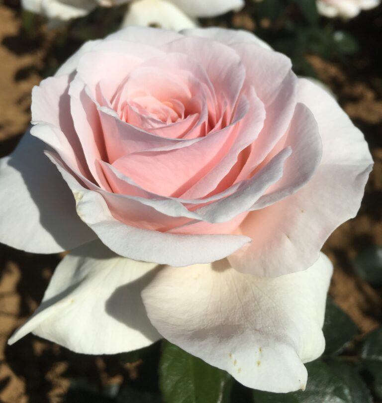 EKIDEN est un rosier buisson à grandes fleurs turbinés blanche nacrée teinté de rose avec un parfum puissant et généreux. -
