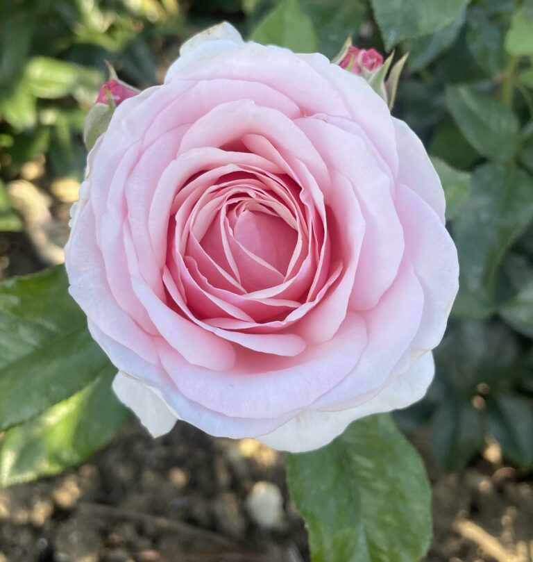 DRAKKAR est un rosier au port compact et des roses de grandes tailles (14 cm) rose poudré. -