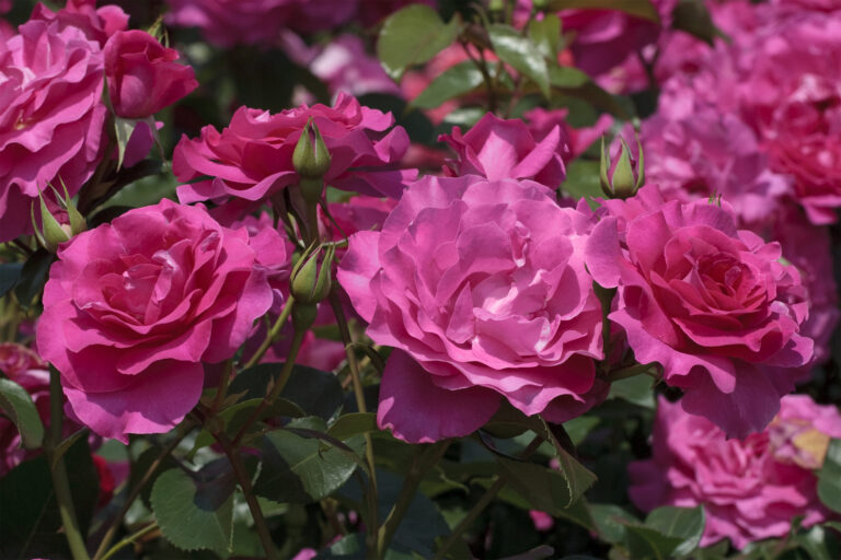 MANOU MEILLAND est un rosier buisson à fleurs groupées rose vif parfumées. Il est très floriflère. Son feuillage est vert foncé mat.