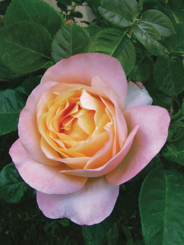 LAURETTE FUGAIN est un rosier buisson rose ambré, offrant une floraison généreuse et une végétation vigoureuse de couleur verte brillante. -