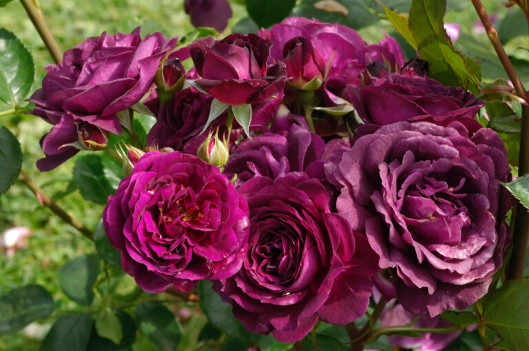 PURPLE EDEN est un rosier buisson remontant à fleurs groupées de couleur prune au parfumfrais et épicé. -