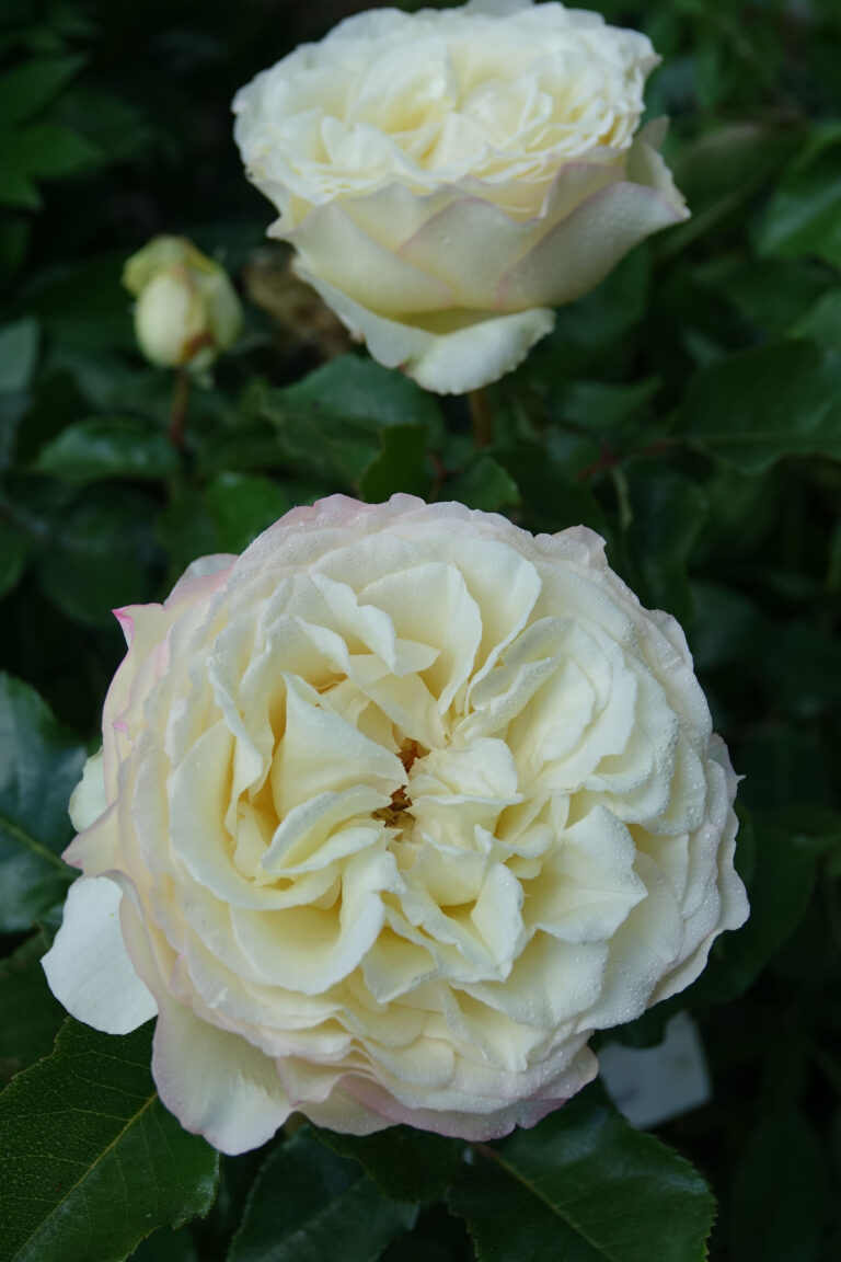 TOBAGO ODORE est un rosier aux grandes roses doubles en forme de pivoine, blanches légèrement ourlées de rose pâle, qui exhalent un parfum puissant aux notes de jasmin, de jacinthe et de tabac. -