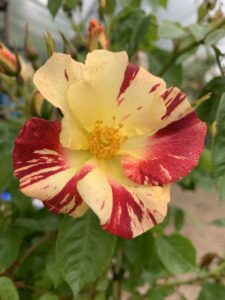 PUPPY est un rosier grimpant à fleurs groupées de couleurs striées jaune et framboise. Il est remontant et avec une bonne resistance aux maladies. -