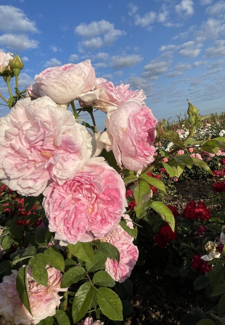 PARFRUM ROYAL Gpt est un rosier grimpant aux grandes fleurs rose nacrée parfumée. -