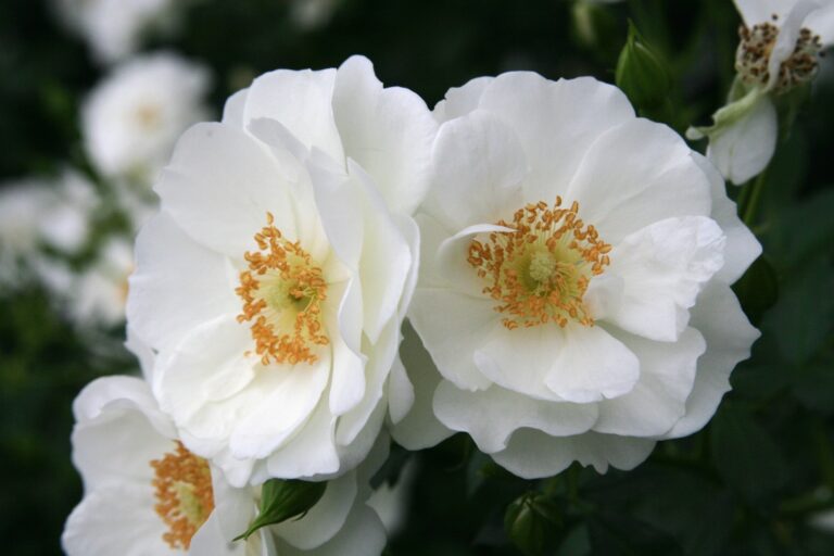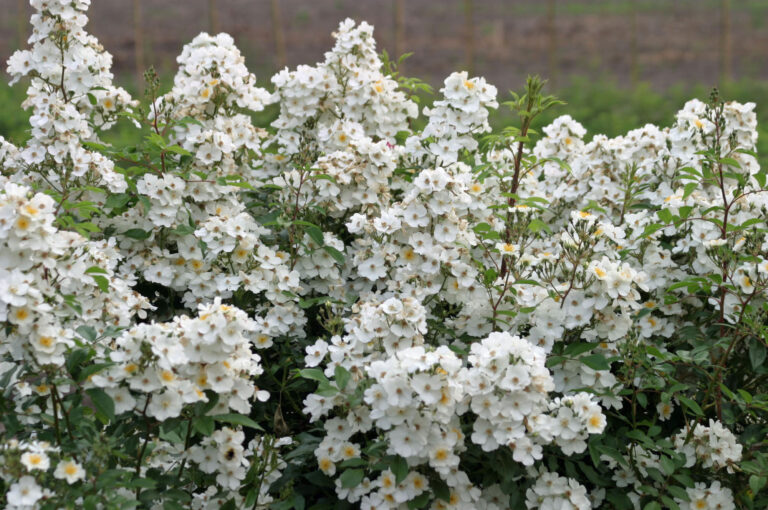 ROSANATURE ALBA est un rosier paysager aux petites fleurs simples, blanches à cœur jaune, réunies en longues panicules. Il est très florifère, mellifère et agréablement parfumé. -