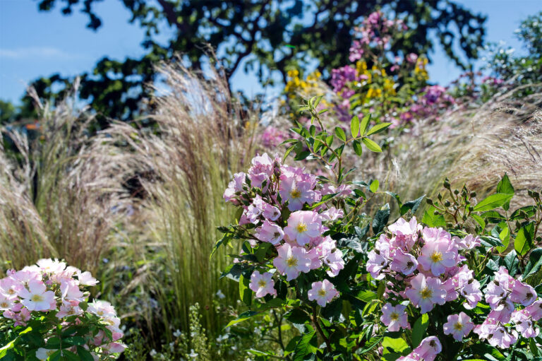 ROSANATURE ROSEA est un rosier paysager aux petites fleurs simples, rose clair à base blanche autour d'un cœur jaune, réunies en longues panicules. Il est très florifère, mellifère et agréablement parfumé. -