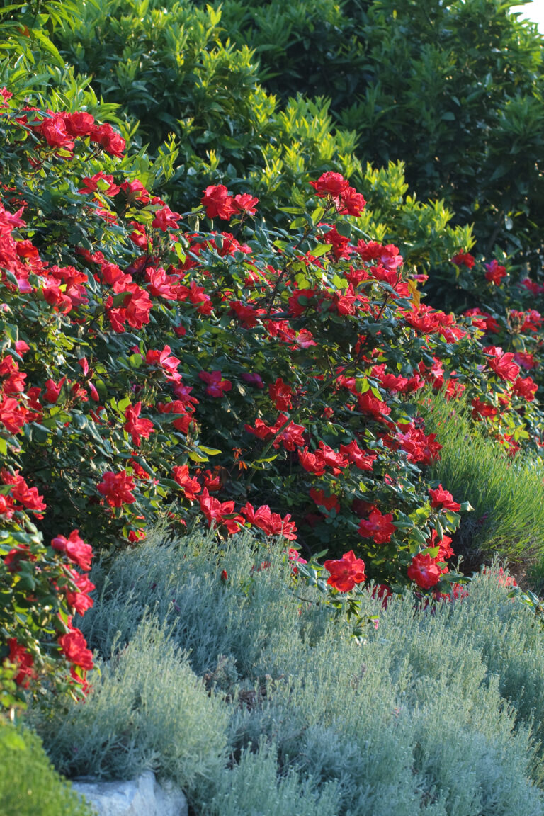 VESUVIA est un rosier paysager rouge sombre rehaussées de jaune très florifère, sans entretien, naturellement résistant aux maladies. Il existe en grimpant. -