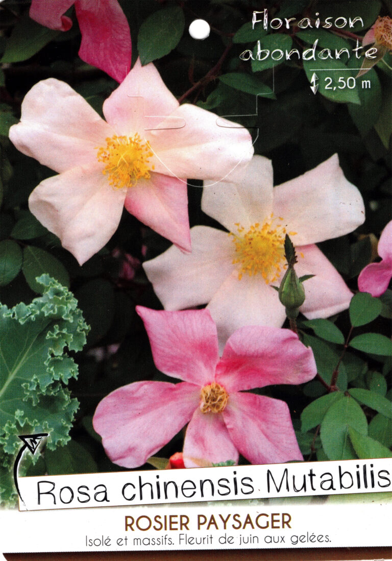 CHINENSIS MUTABILIS est un rosier de Chine à la floraison longue et aux couleurs changeantes et chatoyantes (jaune, orange, rouge et rose). Ce rosier présente des fleurs simples. -