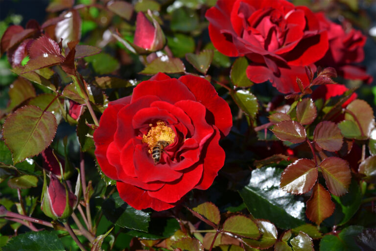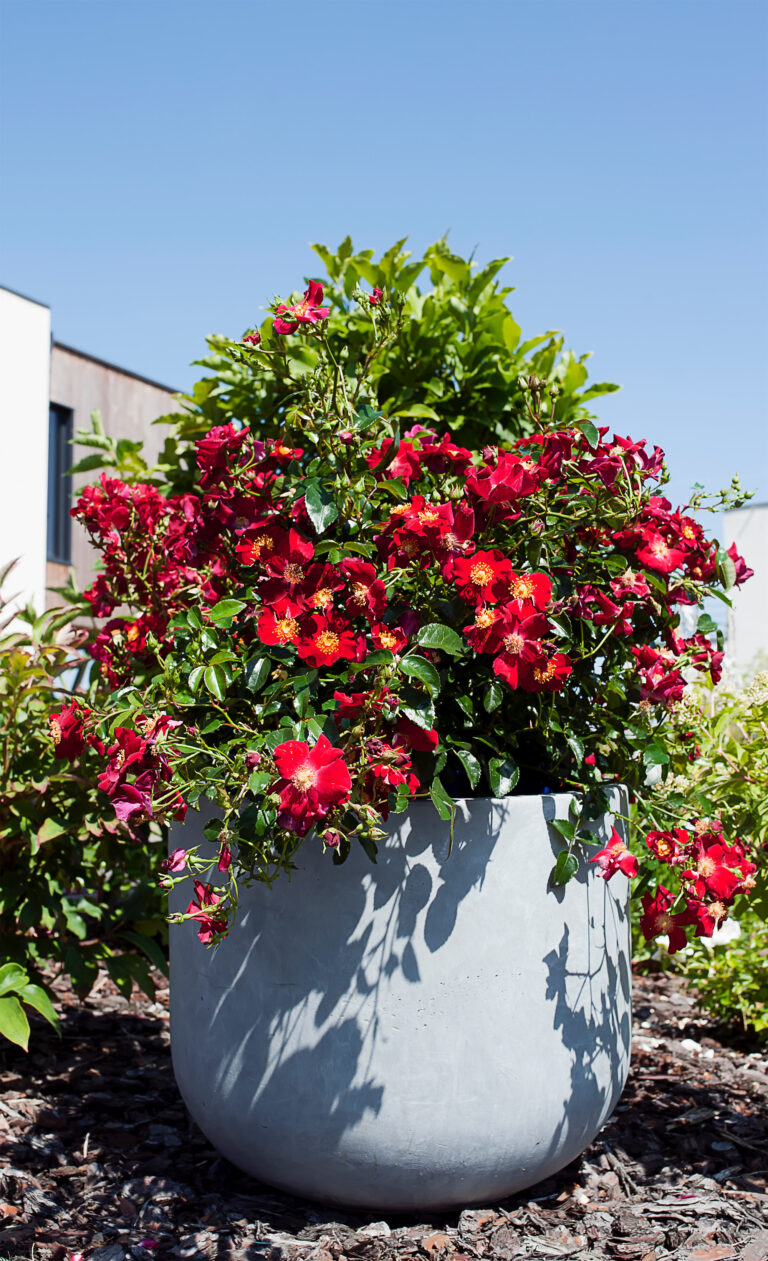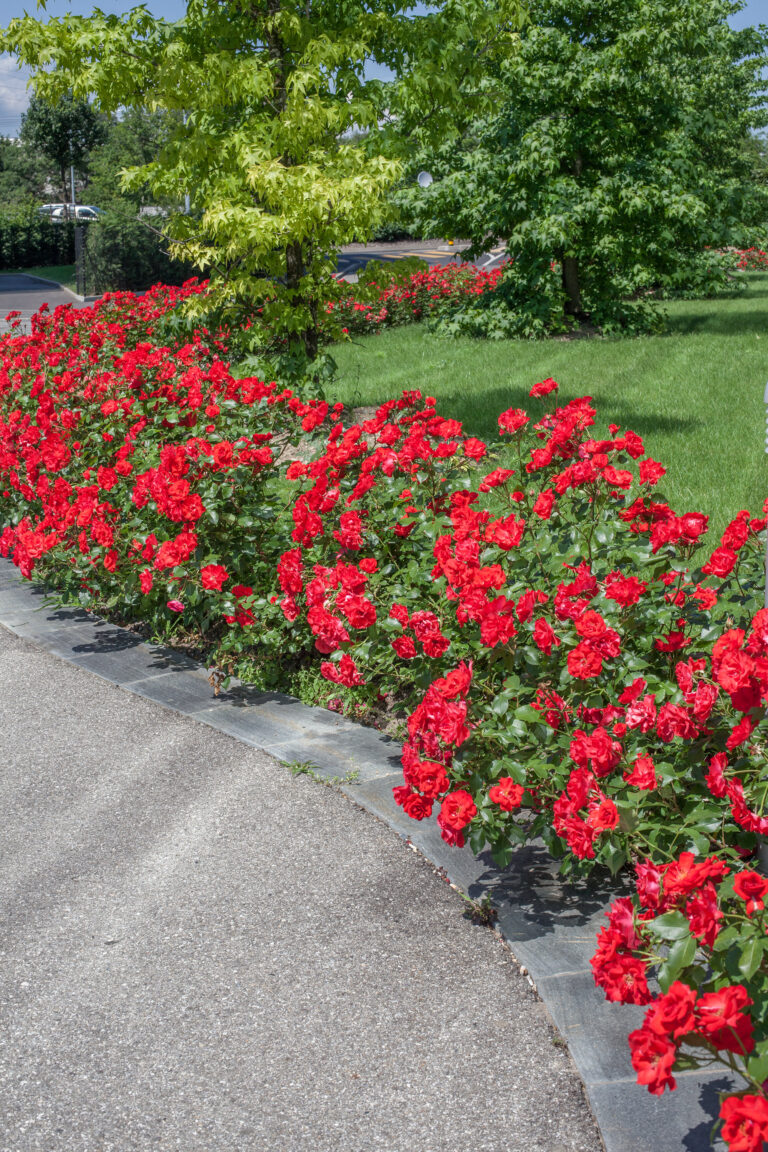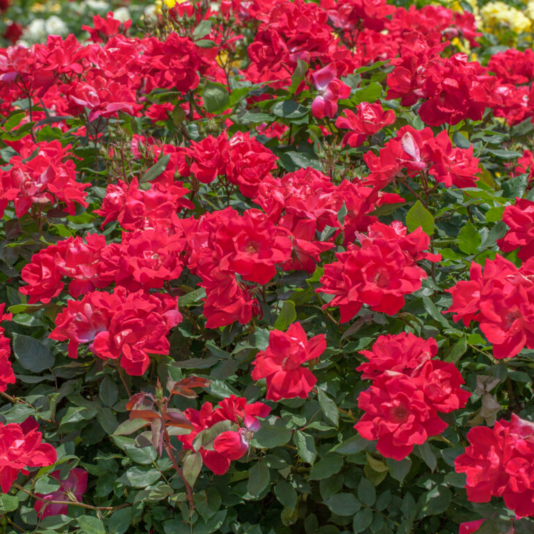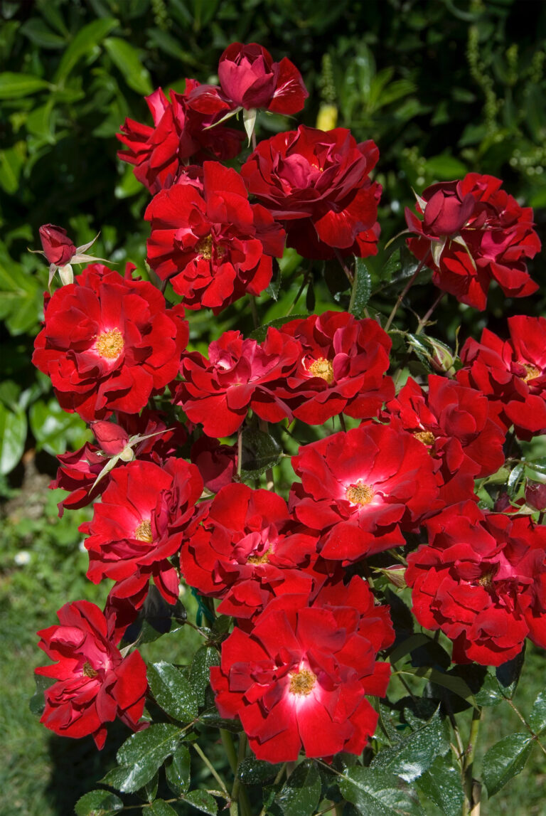 VESUVIA est un rosier paysager rouge sombre rehaussées de jaune très florifère, sans entretien, naturellement résistant aux maladies. Il existe en grimpant. -