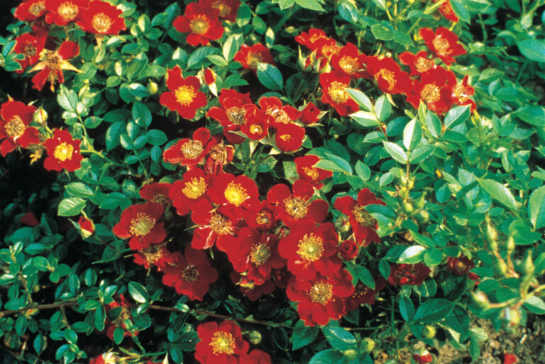 TAPIS ROUGE est un rosier couvre sol aux petites fleurs d'un rouge sang avec un coeur d'étamines dorées. -
