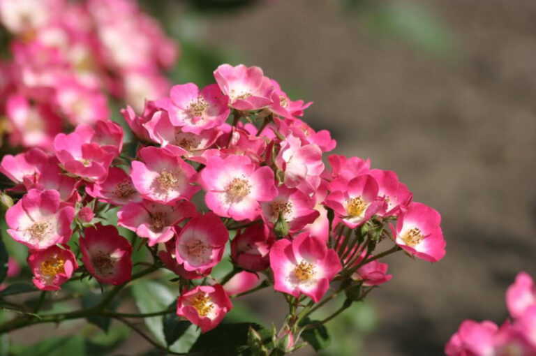 ROSANATURE BICOLORE est un rosier paysager aux petites fleurs simples, rose vif à base blanche autour d'un cœur jaune, réunies en longues panicules. Il est très florifère, mellifère et agréablement parfumé. -