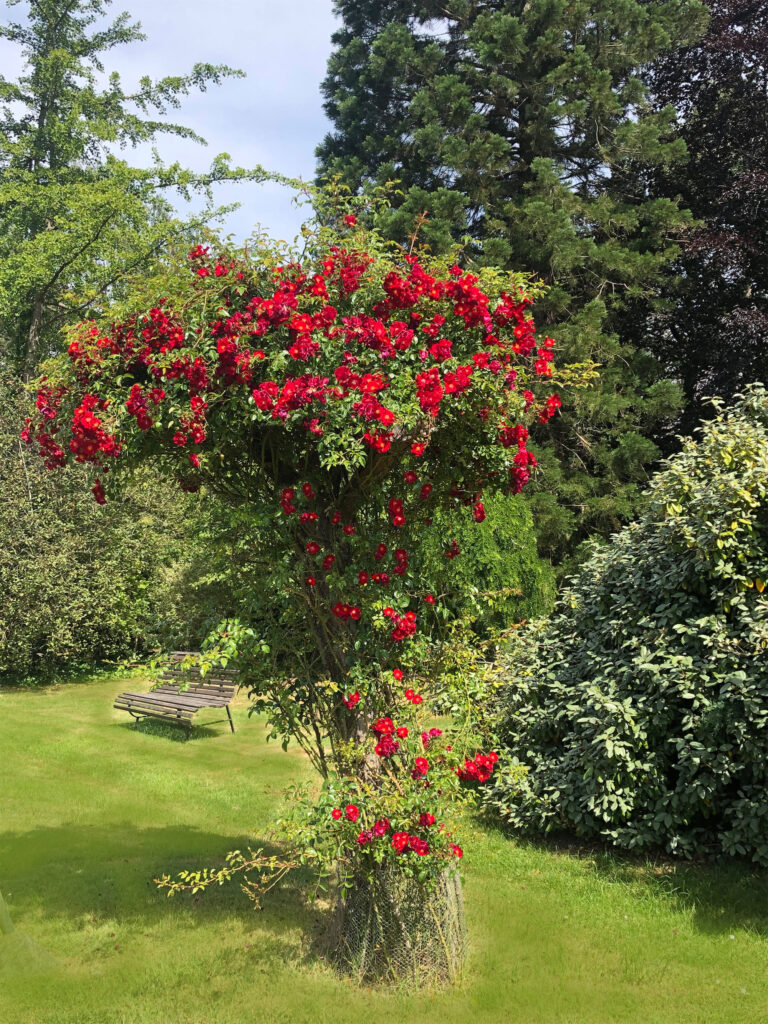 VESUVIA vous est proposé en format pleureur (170cm). C'est un rosier grimpant rouge sombre rehaussées de jaune très florifère, sans entretien, naturellement résistant aux maladies. Il existe en paysager. -