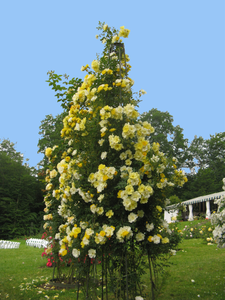 GHISLAINE DE FELIGONDE est produit pleureur (170cm). C'est un rosier ancien aux petites fleurs groupées jaune abricot, puis pâlissent en ivoire. -