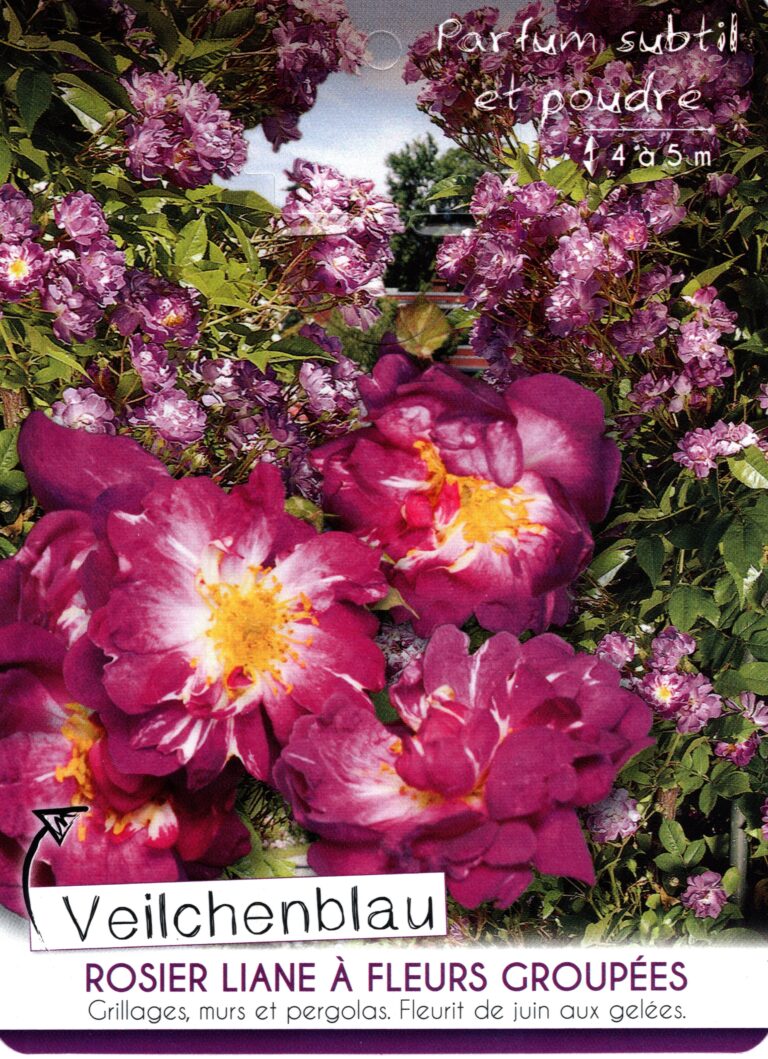 VEILCHENBLAU vous est proposé en pleureur (170cm). C'est un rosier à petites fleurs violet-pourpré sur fond blanc à l'éclosion évoluant vers des reflets bleutés. La floraison est unique. Il est également produit en grimpant. -