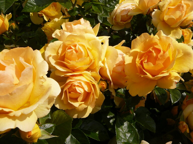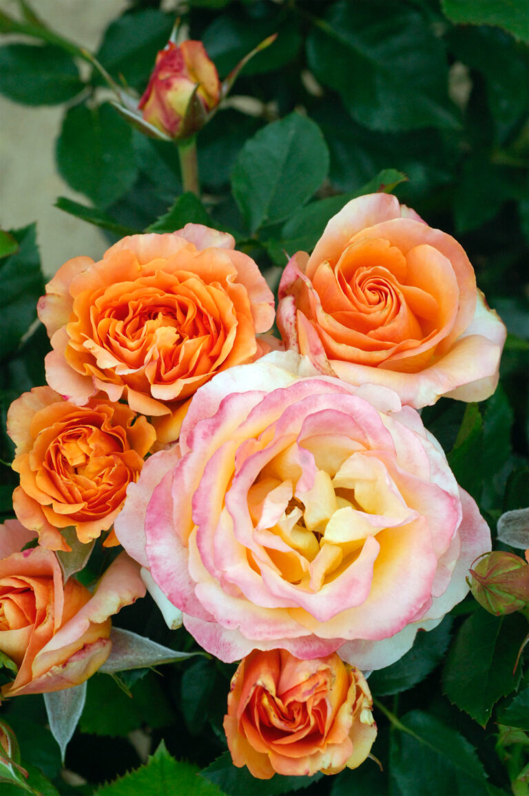 TERRA BOTANICA est un rosier aux fleurs groupées orange lumineux légèrement parfumées. Il est également produit en tige.